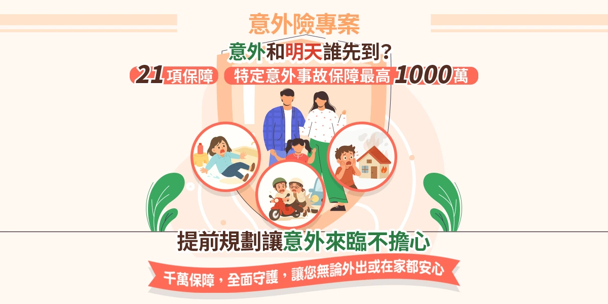 一般意外事故保險最高保障500萬,特定意外事故增額給付最高保障1,000萬。